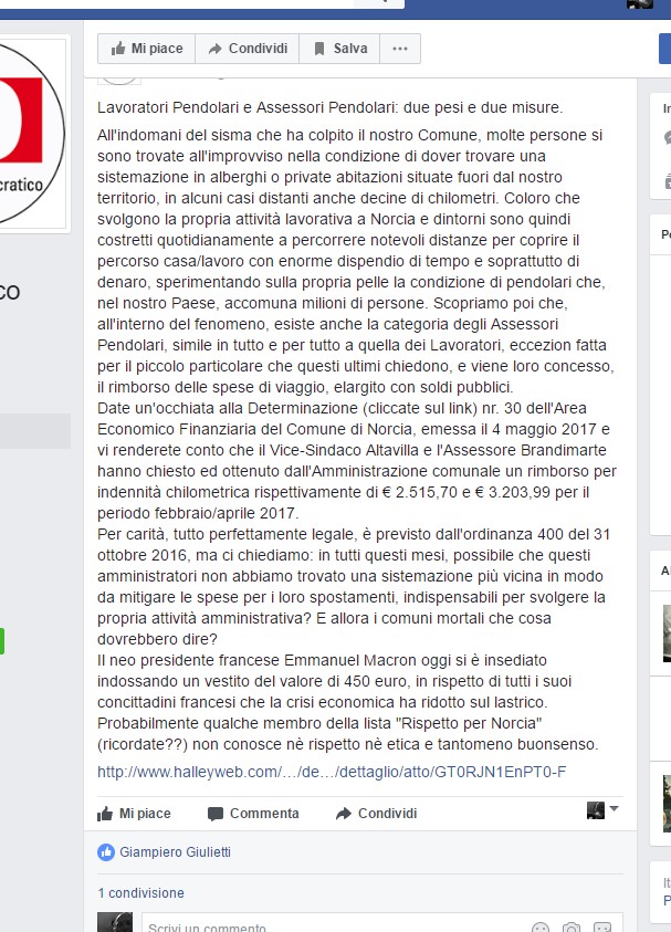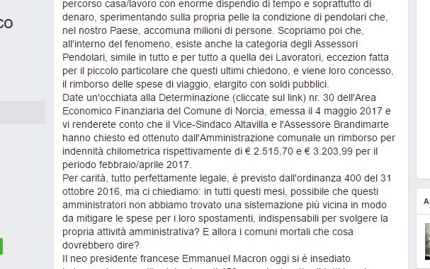 Date un’occhiata alla Determinazione (cliccate sul link) nr. 30 dell’Area Economico Finanziaria del Comune di Norcia, emessa il 4 maggio 2017 e vi renderete conto che il Vice-Sindaco e l’Assessore B. hanno chiesto ed ottenuto dall’Amministrazione comunale un rimborso per indennità chilometrica rispettivamente di € 2.515,70 e € 3.203,99 per il periodo febbraio/aprile 2017.