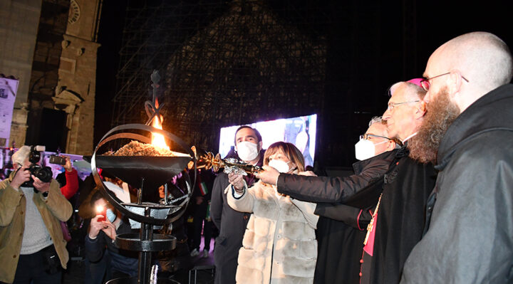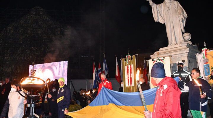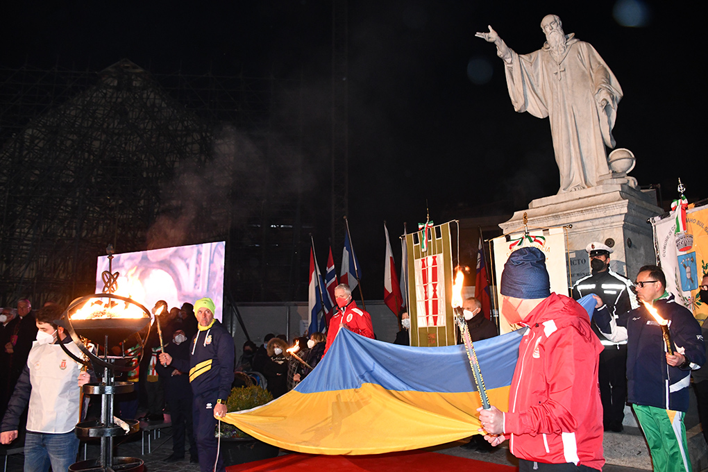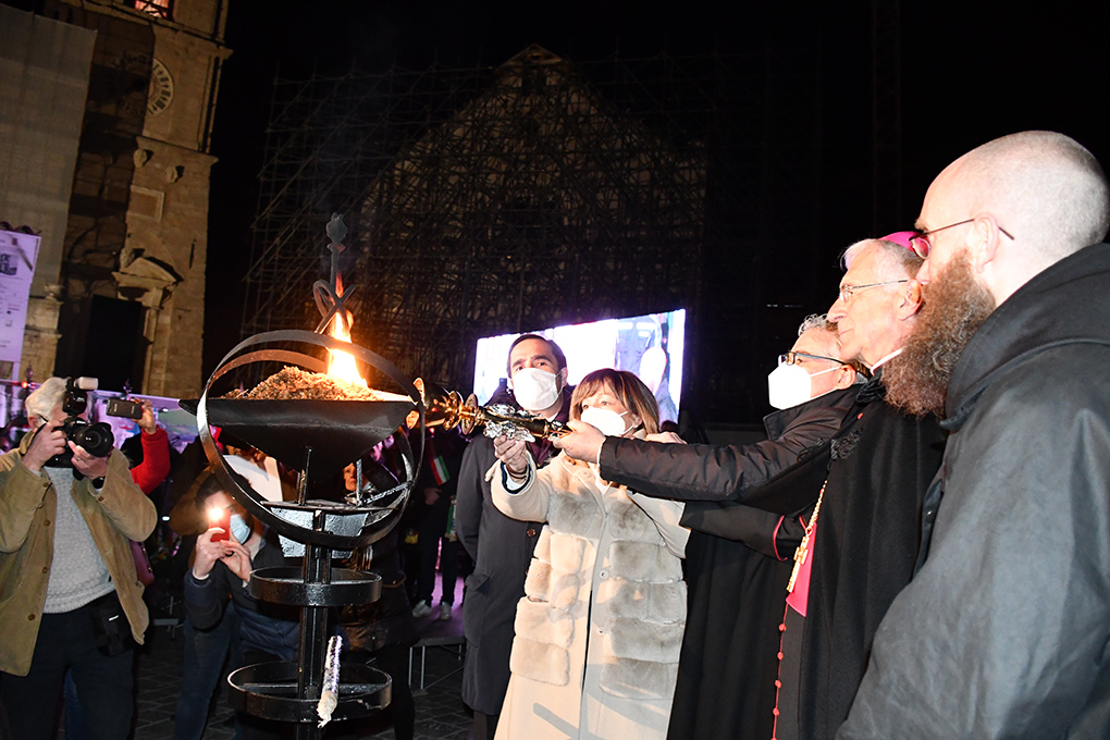 «È un momento di festa – ha detto l’arcivescovo di Spoleto-Norcia mons. Renato Boccardo nell’accogliere in piazza la Fiaccola – e al tempo stesso di tristezza. Tutti noi assistiamo impotenti, giorno dopo giorno, alla barbarie che si sta realizzando in Ucraina. E tutti sentiamo nascere dentro di noi un moto di ribellione: non è possibile dopo il 2000 vivere ancora giorni come quelli che stiamo vivendo. Accogliere la Fiaccola di S. Benedetto, allora, diventa per tutti noi un monito che ci invita a diventare operatori di pace e un impegno che noi ci assumiamo qui, all’ombra di S. Benedetto, per dire no ad ogni forma di violenza e di sopraffazione».