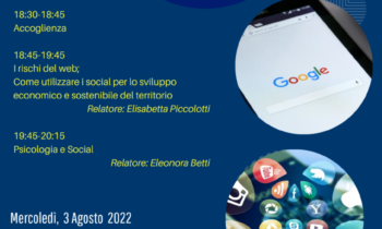 L’incontro si svolgerà in due sessioni: “I rischi del web; come utilizzare i social per lo sviluppo economico e sostenibile del territorio” relatore la dott.ssa Elisabetta Piccolotti e “Psicologia e Social”, relatore dott.ssa Eleonora Betti.