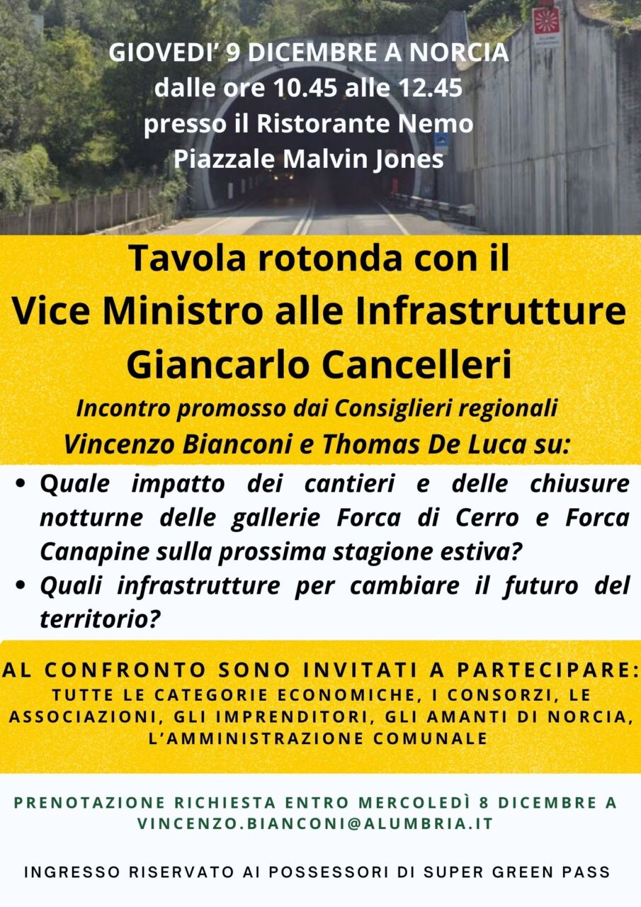 Il prossimo Giovedì 9 Dicembre, alle ore 10.45 presso il Ristorante Nemo, piazzale Malvin Jones, a Norcia, avrà luogo una tavola rotonda promossa dai consiglieri regionali Vincenzo Bianconi e Thomas De Luca alla presenza del vice Ministro per le Infrastrutture, Giancarlo Cancelleri sul tema: “Quale impatto dei cantieri e delle chiusure notturne delle gallerie Forca di Cerro e Forca Canapine sulla prossima stagione estiva? – Quali infrastrutture per cambiare il futuro del territorio?”.