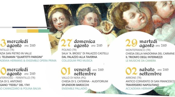 VALLO DI NERA. In attesa di aprire i festeggiamenti dell’ottocentesimo compleanno di Vallo di Nera, in programma il 23 e 24 settembre prossimi, il Festival di Musica antica della Valnerina fa tappa nel centro della Valnerina con un concerto dedicato alla musica barocca. L’appuntamento è per venerdì 1 settembre alle ore 21,15 nella chiesa-auditorium di Santa Caterina, con ingresso libero.