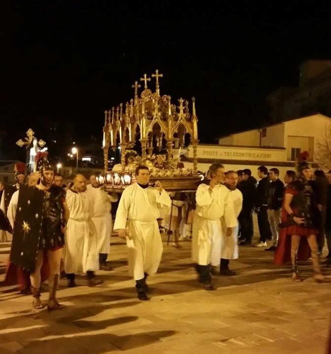 La processione, organizzata dalla Confraternita della Buona Morte, è iniziata come di consueto dalla Chiesa di Santa Maria alle 21:30, da dove i figuranti hanno intrapreso il cammino lungo circa 4 kilometri, che ha attraversato le vie principali, le due piazze, il centro storico per poi culminare nella Basilica di Santa Rita. La sfilata, che viene eseguita da ogni figura a piedi nudi, è stata aperta dalla prima delle stazioni della Via Crucis che, dipinte su vari stendardi, si drammatizzano in una sacra rappresentazione, grazie a uomini e donne che si impegnano a rappresentare le figure che replicano l’evento.
