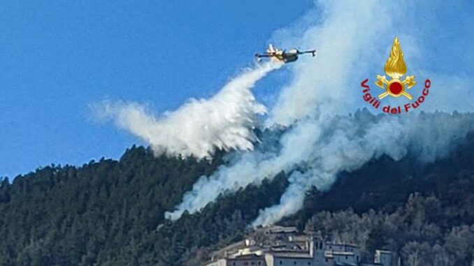 Incendio bosco a Sellano, vigili del fuoco a lavoro, anche con canadair