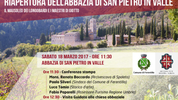 L’Abbazia di San Pietro in Valle riapre ai visitatori dopo il sisma FERENTILLO – Sabato 18 marzo alle ore 11:30 riaprirà al pubblico la Chiesa abbaziale di San Pietro in Valle. All’evento della riapertura ufficiale presenzieranno l’Arcivescovo di Spoleto Mons. Renato Boccardo, il Sindaco del Comune di Ferentillo Paolo Silveri, l’Assessore regionale al Turismo Fabio Paparelli e lo Storico d’arte Luca Tomio.