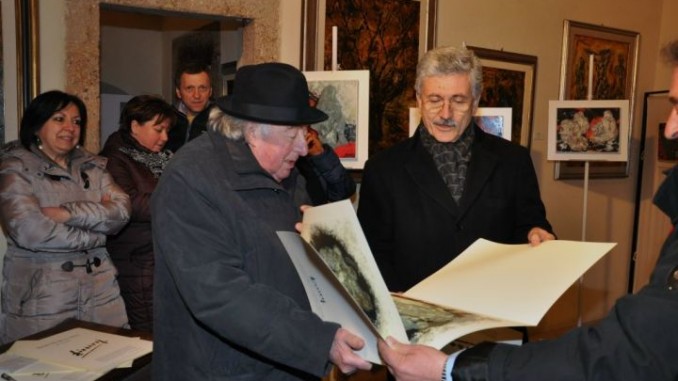 da Gino GOTI – NORCIA – A Massimo D’Alema, uomo di mare e presente a Norcia per il famoso tartufo, prodotto della terra, non poteva sfuggire una mostra particolare dedicata, in qualche modo, al mare. Quindi, accompagnato dalle autorità e dagli organizzatori, ha voluto visitare la mostra di Sergio Bizzarri, “I racconti dei sassi del mare”, nell’atrio della Castellina. D’Alema ha chiesto il perché di questa ispirazione e ha fatto i complimenti al pittore spoletino per le precise e suggestive sfumature di tutti i colori che l’acqua del mare offre. “Nei suoi quadri – ha detto D’Alema al pittore – sembra di vedere l’esperienza e la conoscenza di un vecchio lupo di mare che abbia attraversato gli oceani che offrono, a una vista acuta e alla sensibilità di un artista, i colori e le sfumature più diverse”. Bizzarri ha donato all’illustre ospite una cartella, con riproduzioni numerate della collezione dei racconti, e poi lo ha accompagnato a visitare le sale dove sono esposte le sue 49 opere, una vera e propria antologica, donate al comune di Norcia. Oltre a D’Alema altri ospiti illustri hanno visitato le mostre di Bizzarri e dell’altro spoletino Giacomo Cintio che, oltre all’ormai famosa e stupenda riproduzione della “biga di Monteleone” ha esposto i suoi “colori del ferro”: particolari vedute della Valnerina, di Spoleto, nudi, una Venere di Samotracia, ritratti, temi etruschi realizzati da vecchie e arrugginite lastre di ferro cui Cintio ha dato nuovo splendore artistico. Il Sindaco Alemanno, gli attori, i cantanti e gli artisti di strada che stanno qualificando il Nero Norcia Festival 2015 hanno visitato con interesse e compiacimento le due mostre.