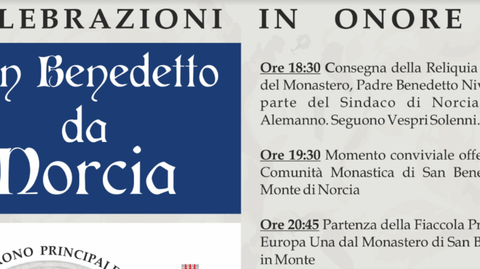 Sabato 10 e domenica 11 luglio a Norcia si terranno le celebrazioni in onore di San Benedetto, in occasione della Memoria Liturgica della Chiesa. Due giorni in cui sono previste una serie di iniziative per rendere omaggio al Santo Patrono con il ritorno della ‘Fiaccola Benedettina Pro Pace et Europa Una’, a Norcia dopo oltre un anno e mezzo.