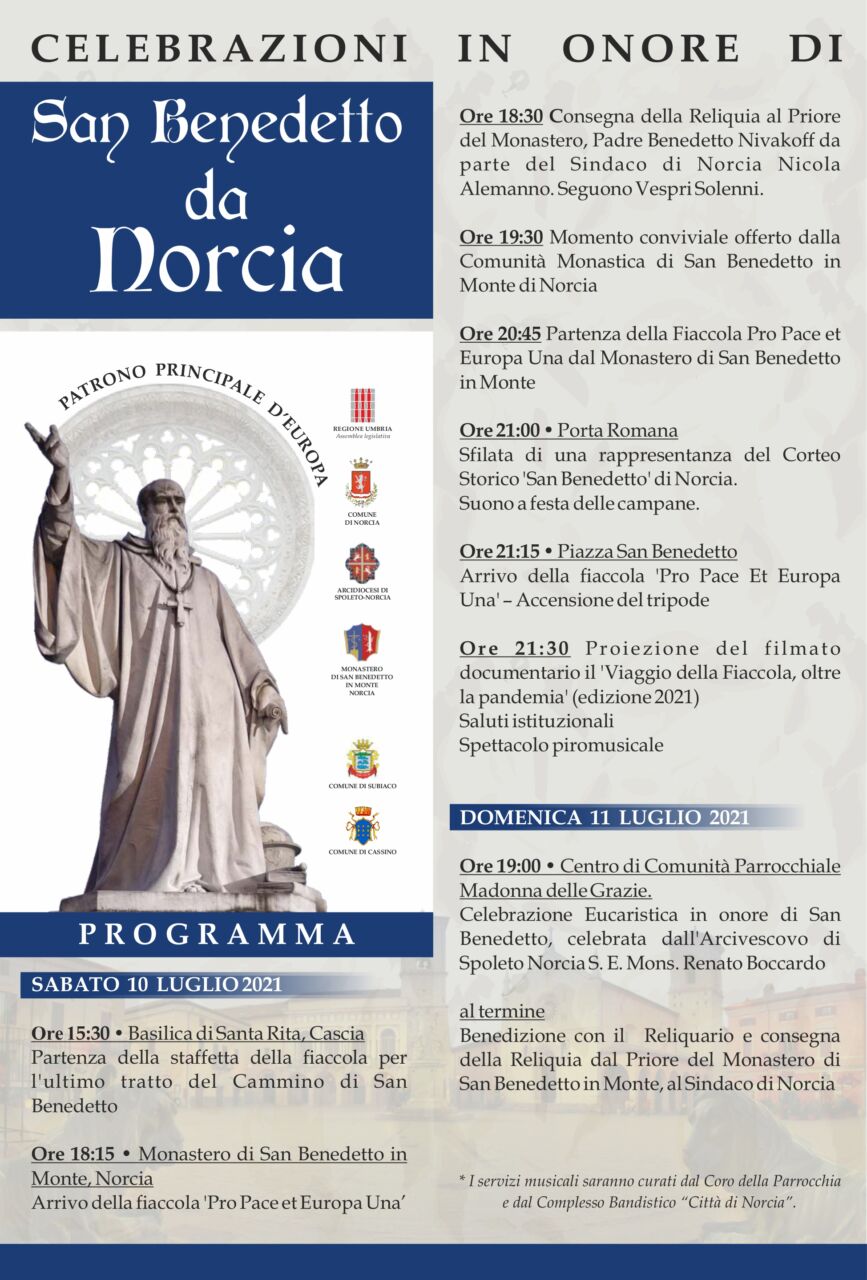 Il programma prevede alle 15,30 la partenza della staffetta della Fiaccola, dalla Basilica di Santa Rita a Cascia, per percorrere l’ultimo tratto del Cammino di San Benedetto. Alle 18,15 la Fiaccola arriverà al Monastero di San Benedetto in Monte, accolta dal Priore Padre Benedetto Nivakoff. Alle 21,15 la Fiaccola arriverà in Piazza San Benedetto dove sarà proiettato il video ‘Viaggio della Fiaccola, oltre la pandemia’ (edizione 2021), a seguire i saluti istituzionali e al termine delle serata lo spettacolo piromusicale.