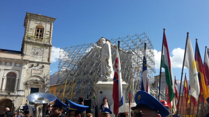 Oggi dunque tanta gente è tornata a Norcia per rendere omaggio al Patrono della città, e assistere nuovamente ad una messa all’interno delle mura urbiche, dopo che tutte le chiese sono state compromesse. Mons. Boccardo nell’omelia rimarca sulla ricostruzione “soprattutto del tessuto sociale” e riallacciandosi alla riunione Europea del 24 marzo, la coglie come “un’occasione propizia, affinché quanti sono stati eletti a Bruxelles e a Strasburgo confermino il sogno europeo e si domandino se il progetto che stanno realizzando rimane fedele all’intuizione dei padri fondatori – continua il Presule – che hanno voluto edificare l’Unione Europea su una base non individualistica e materialista bensì di ordine culturale e spirituale”.