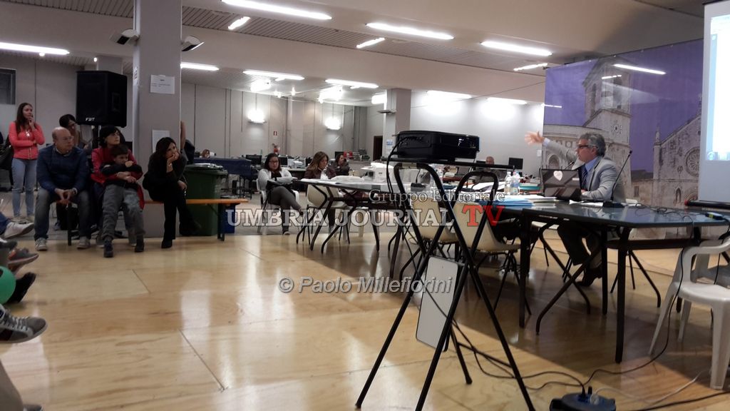 Per quanto riguarda la scuola media il sindaco rimarca come non abbiano avuto danni, forti anche della presenza di dissuasori che la rendono, insieme ad altri 8 edifici in Italia, tra le più sicure. Diverso il discorso invece per le elementari che, avendo avuto cedimenti a muri strutturali, è prevista una ricostruzione totale con adeguamento antisismico, per altro già programmata. Il sindaco intanto annuncia entro febbraio 2017 il completamento dei lavori della scuola materna, con la conversione della piscina coperta eretta nel 1982 e mai aperta, già obiettivo della prima amministrazione Alemanno; la struttura potrà ospitare 180 bambini disposti in 6 aule da circa 45mq l’una. Inoltre, novità della serata, grazie ad una Fondazione entro novembre sarà costruita la nuova aula magna delle scuole elementari, con soffitto e pavimento in legno e sarà pista sotto al campo di pattinaggio.