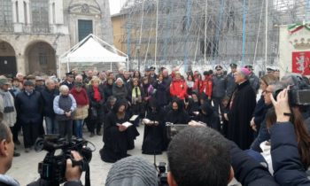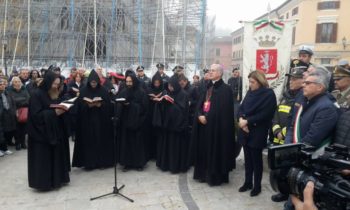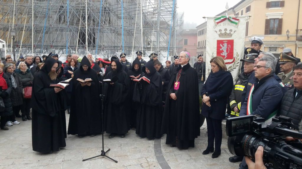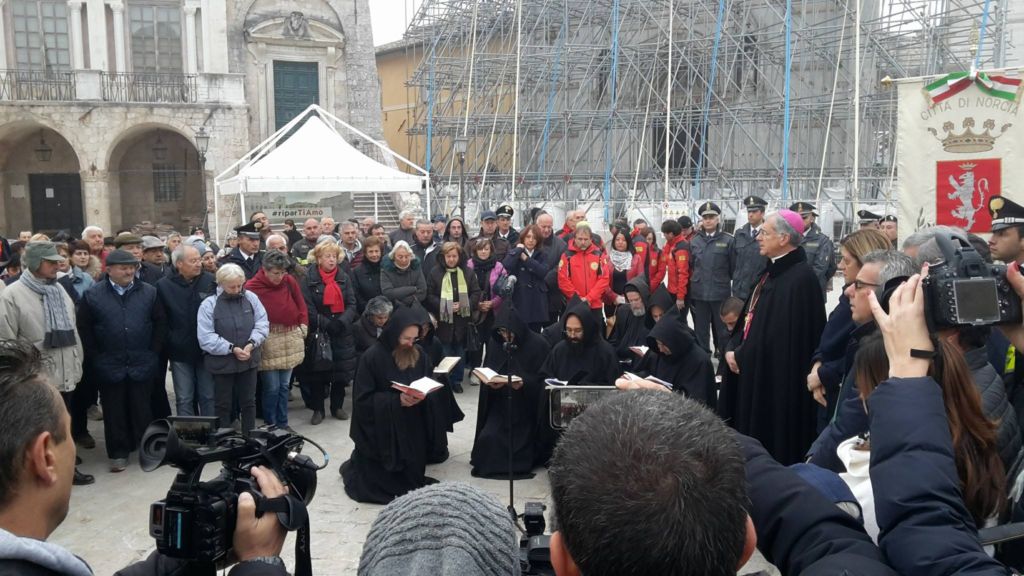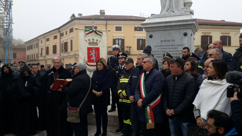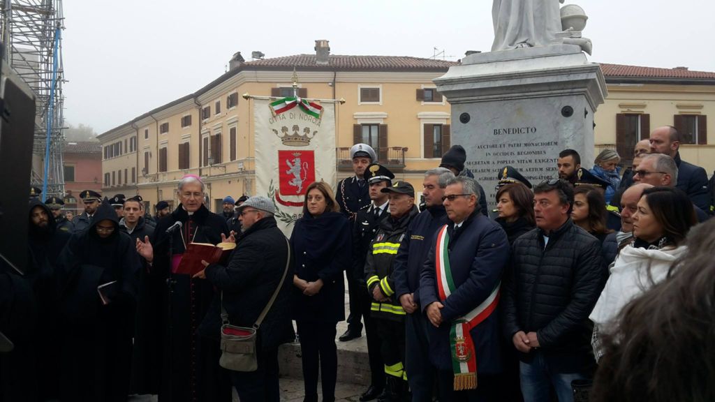 NORCIA – Ore 7.41 di un anno fa il terremoto più forte. Le campane hanno suonato e poi, in un grande silenzio pieno di emozione, i monaci benedettini hanno intonato il canto “Veni Creator”. Si sono ritrovati in alcune decine, in piazza san Benedetto a Norcia alle 7,41 precise, per ricordare che è già passato un anno dalla grande scossa di terremoto di magnitudo 6.5 che, allo stesso orario del 30 ottobre 2016, sconvolse il capoluogo della Valnerina ed altri centri dell’Umbria, come Preci, Cascia e Castelluccio. In piazza, insieme al vescovo, Renato Boccardo, ed ai rappresentanti delle istituzioni, anche molti dei volontari impegnati nell’emergenza dopo il sisma.