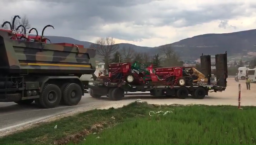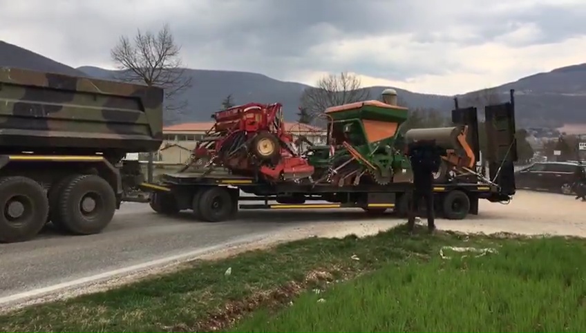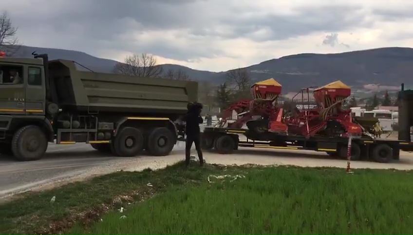 Semina lenticchia Castelluccio, seminatrici e trattori a cingoli partiti, trainati dai mezzi dell'esercito