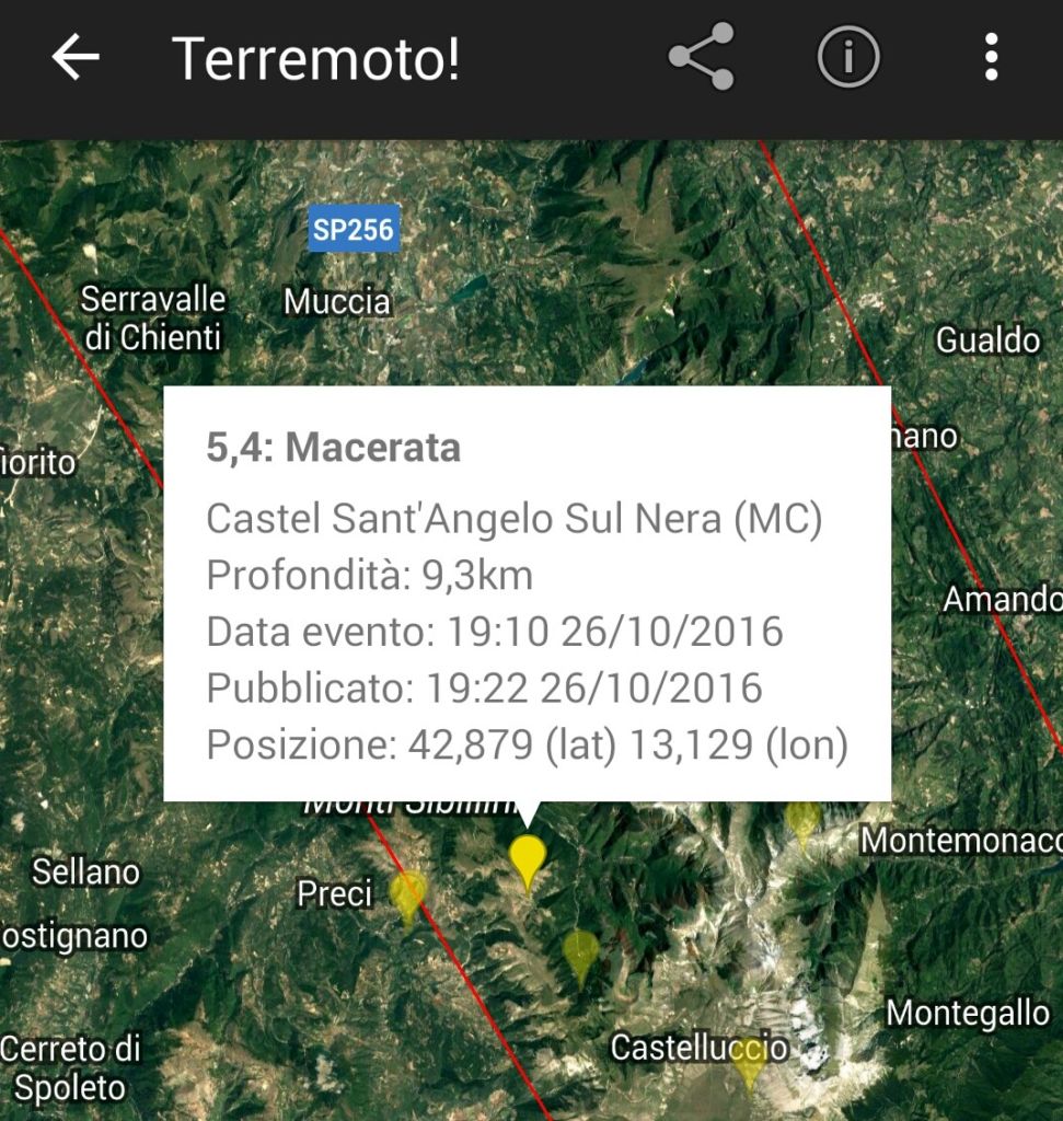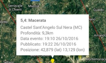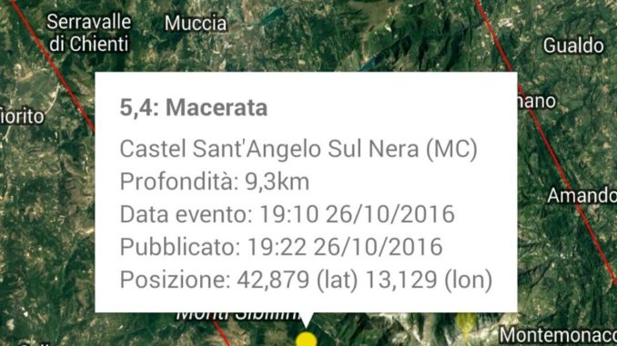Terremoto, fortissima scossa avvertita a Norcia, trema ancora la terra. Una fortissima scossa di terremoto è stata avvertita dalla popolazione il 26 ottobre 2016 alle ore 19.10. A due mesi dal violenta sisma del 24 agosto, la terra continua a tremare, anzi non si è mai fermata. Il terremoto è stato registrato nella zona compresa tra Perugia e Macerata il centro più vicino è Castel Sant’Angelo sul Nera. Il magnitudo è stato di 5.4 e a una profondità di 9.3 chilometri. Lo ha reso noto l’Istituto nazionale di Geofisica e Vulcanologia (Ingv). Il terremoto è collegato a quello avvenuto il 24 agosto nel Reatino. Lo ha detto il sismologo Alessandro Amato che ha anche spiegato che è avvenuto su un’altra struttura collegata a quel sistema di faglie. Secondo le prime analisi la nuova struttura attivata si troverebbe qualche chilometro più a Nord della faglia attivata il 24 agosto.