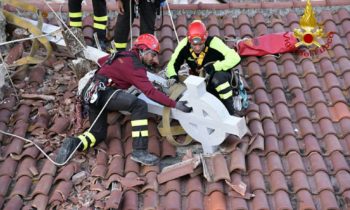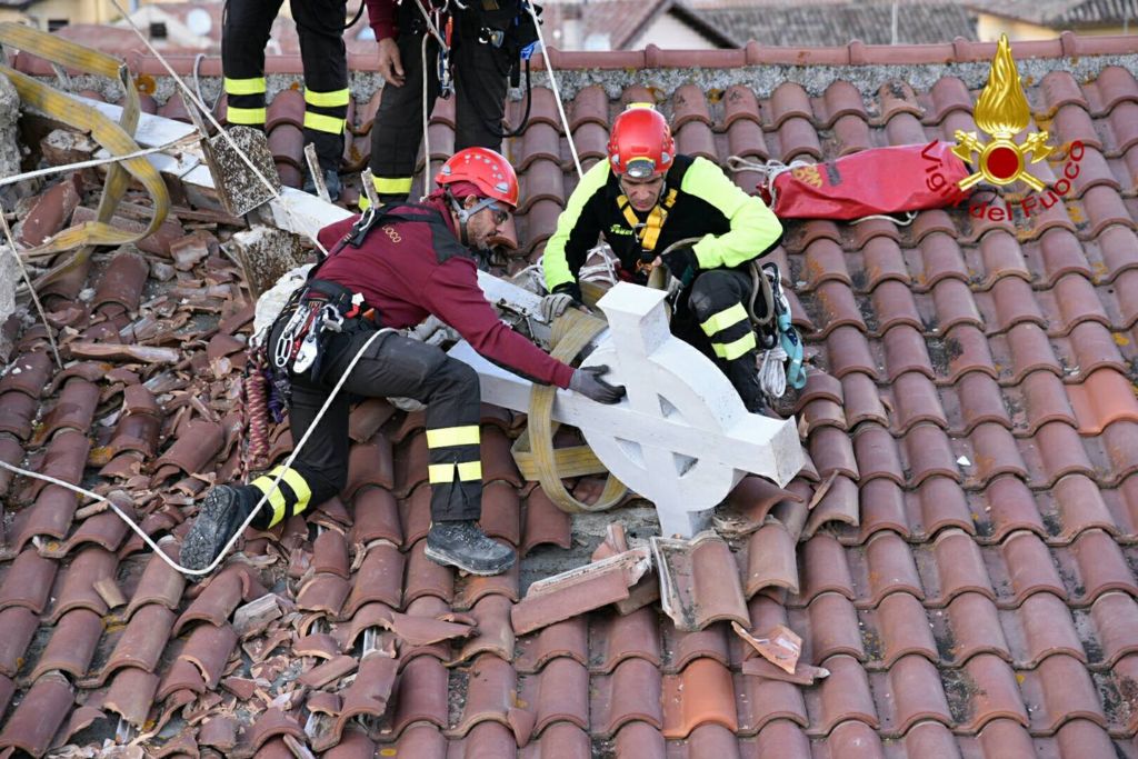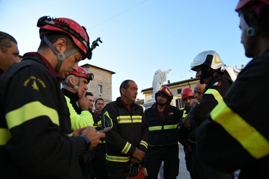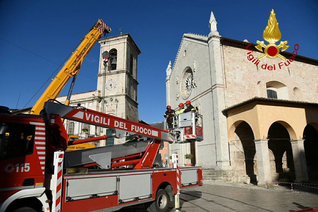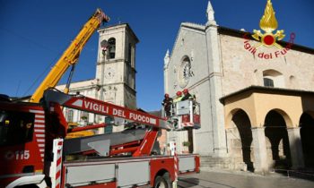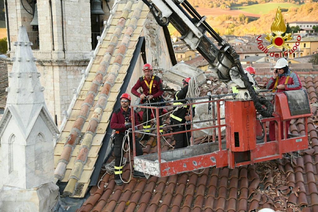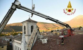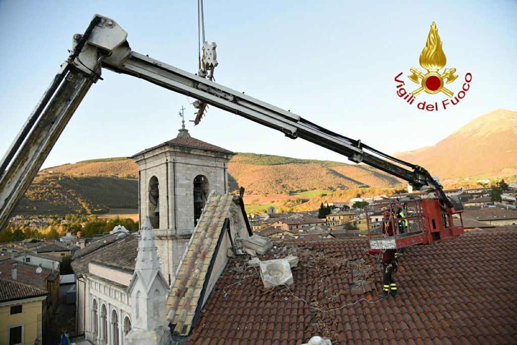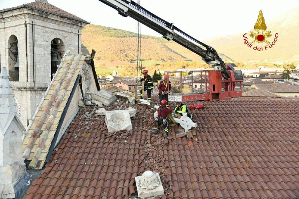 Vigili del Fuoco a Norcia recuperano croce e guglie chiesa di San Benedetto. Dopo le recenti scosse di maggior intensità che si sono verificate a partire dal pomeriggio del 26 ottobre i vigili del fuoco hanno ripreso le attività che caratterizzano le ore immediatamente successive alle crisi sismiche vale a dire aiuto alla popolazione per il recupero dei beni di prima necessità dalle proprie abitazioni che hanno dovuto lasciare con rapidità, per la rimozione di alcune parti pericolanti che impediscono l’uso di spazi sottostanti, le verifiche di stabilità per definire se l’immobile è ancora utilizzabile oppure deve essere lasciato libero con immediatezza.