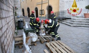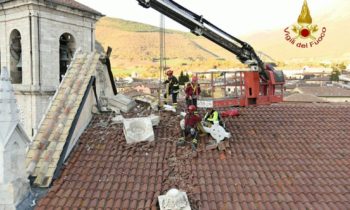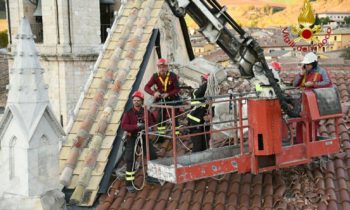 Nella giornata tra gli interventi di maggior evidenza quello effettuato per la messa in sicurezza di alcune parti della Basilica di san Benedetto a Norcia, Basilica dedicata al patrono d’Europa, una costruzione del 1200 che domina la piazza principale. Con una apposita autogrù con uno sbraccio di circa 40 metri ed altri mezzi di supporto si è provveduto a portare al sicuro le parti che si trovavano a rischio per il perdurare dello sciame sismico. Ad operare e’ stato personale specializzato dei vigili del fuoco, con le squadre SAF che ha smontato e rimosso la croce, le cuspidi e diversi elementi architettonici della Basilica mettendoli in sicurezza.