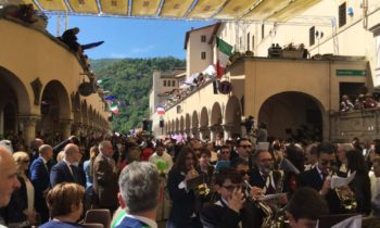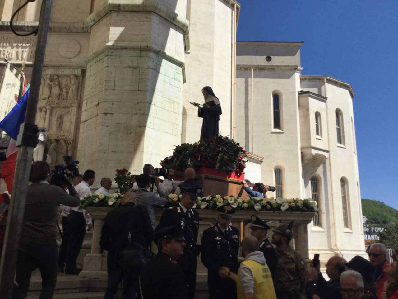 CASCIA – Migliaia di fedeli sono giunti a Cascia da ogni parte d’Italia e del mondo per la festa di Santa Rita. Ad anticipare l’arrivo della statua della Santa degli Impossibili sul viale che porta alla Basilica, i tamburini e il corteo storico, con circa 200 figuranti. Alla statua come da tradizione sono state lanciate e donate rose.
