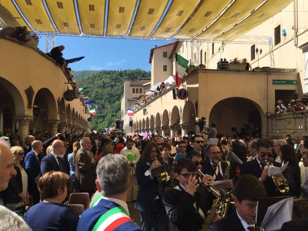 L’omelia è stata affidata al cardinale Giovanni Lajolo. Le suore di clausura, invece, seguono la liturgia dal monastero che si affaccia sulla piazza. Presenti alle celebrazioni, oltre al sindaco della città, Gino Emili, la presidente della Regione Umbria, Catiuscia Marini e la vicepresidente della Camera dei Deputati, Marina Sereni. Presente anche il comune di Assisi.