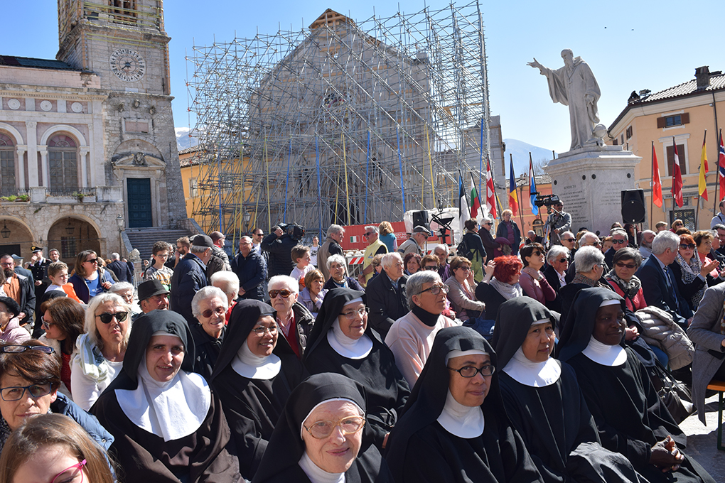 Dopo il corteo storico, che ha sfilato in Piazza proveniente da Corso Sertorio, c’è stata la Messa presieduta dall’arcivescovo di Spoleto-Norcia mons. Renato Boccardo e concelebrata dal parroco di Norcia don Marco Rufini, dal priore dei monaci padre Benedetto Nivakoff e da altri sacerdoti diocesani e religiosi. La gente è accorsa numerosa per pregare. Da Trevi sono giunte anche le monche benedettine di S. Antonio, il cui monastero è in gran parte da demolire. Diverse le autorità presenti, civili e militari: la presidente del Consiglio Regionale dell’Umbria Donatella Porzi, della Giunta regionale Catiuscia Marini, Prefetto e Questore di Perugia, sindaco di Norcia Nicola Alemanno e altri primi cittadini del Comuni che ricadono nel territorio della diocesi di Spoleto-Norcia. Ha animato la liturgia il “Coro S. Benedetto” Città di Norcia diretto da Luca Garbini, con all’organo Andrea Rosati. Di lato all’altare la reliquia del Santo patrono d’Europa contenuta nello splendido reliquiario dorato, che ora è conservato presso il deposito d regionale dei Beni Culturali a S. Chiodo di Spoleto.