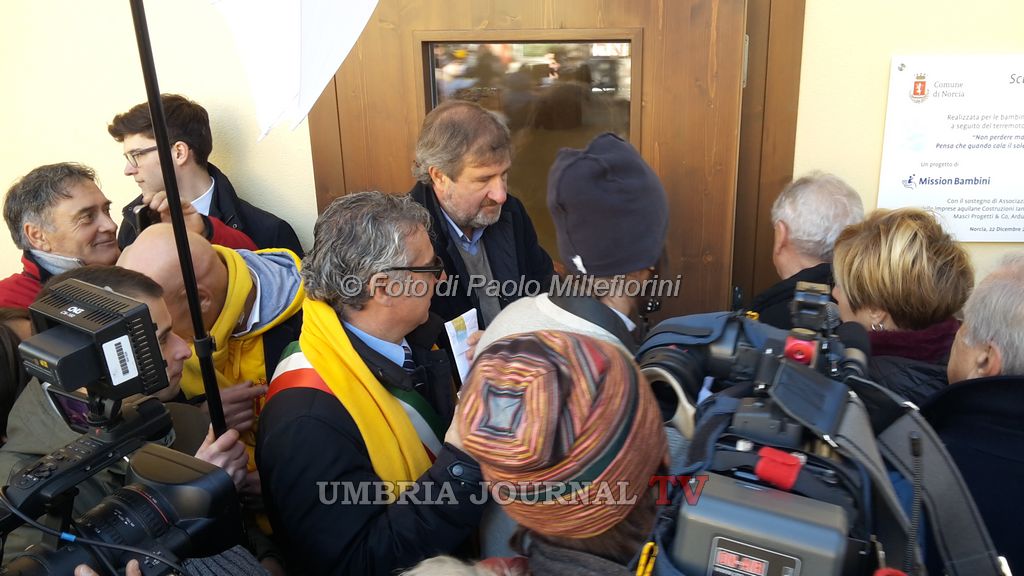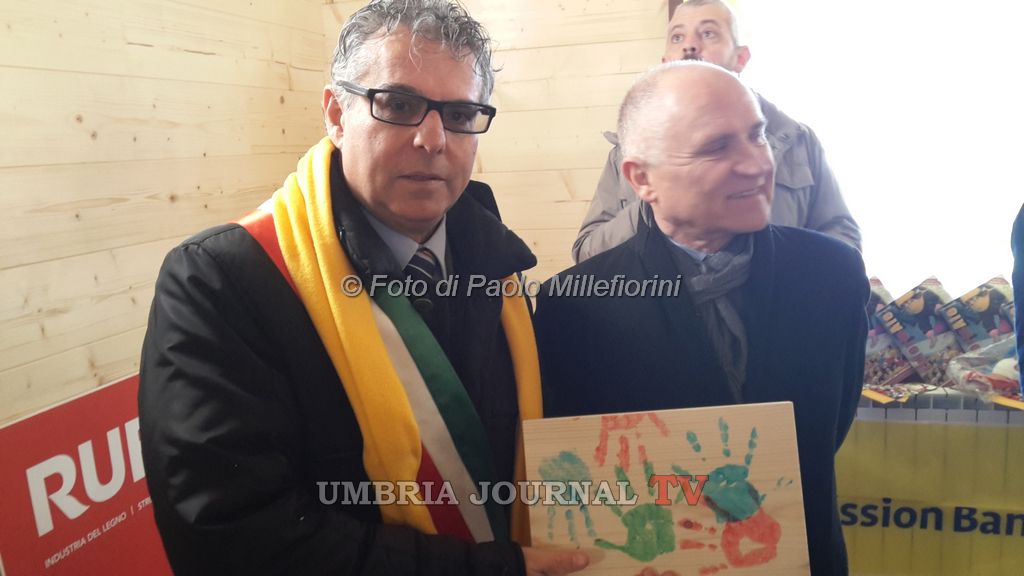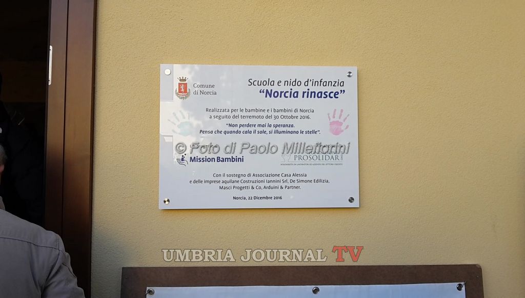 NORCIA – Una bella giornata di sole nel secondo giorno di inverno è stata lo scenario per l’inaugurazione della nuova struttura prefabbricata, realizzata su iniziativa della Fondazione Mission Bambini in accordo con l’amministrazione comunale e finanziata da Fondazione Prosolidar, che dal 9 gennaio ospiterà i bambini della scuola materna e del nido. “Vogliamo dare una nuova speranza e un nuovo futuro ai bambini di Norcia – dice il presidente di Mission Bambini, l’ing. Goffredo Modena – oggi è una giornata di gioia e felicità e vorrei pensare di poter cancellare le insicurezze e le incertezze sul futuro”.
