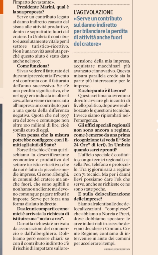 Nell’intervista, la presidente Marini ricorda che “dopo il 24 agosto i turisti sono scappati dal Centro Italia. Prima del 30 ottobre (data della scossa di magnitudo 6.5, n.d.r) avevamo segnali di ripresa; dopo il dramma è stato totale, l’impatto devastante”. Circa le ipotesi di riconoscimento di tale “danno indiretto”, la presidente afferma che “si va a vedere il fatturato degli ultimi due anni precedenti all’evento, e si confronta con il fatturato dell’anno successivo. Se c’è una perdita significativa, che nel 1997 era indicata in oltre il 20%, allora viene riconosciuto all’impresa un contributo pari a una quota della differenza negativa. Quota che nel 1997 era del 20% e comunque non oltre i 100 milioni di lire, cioè 50mila euro di oggi”.