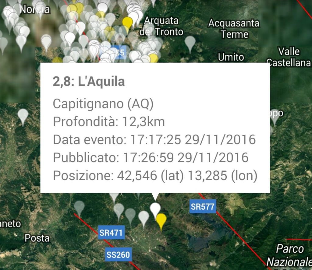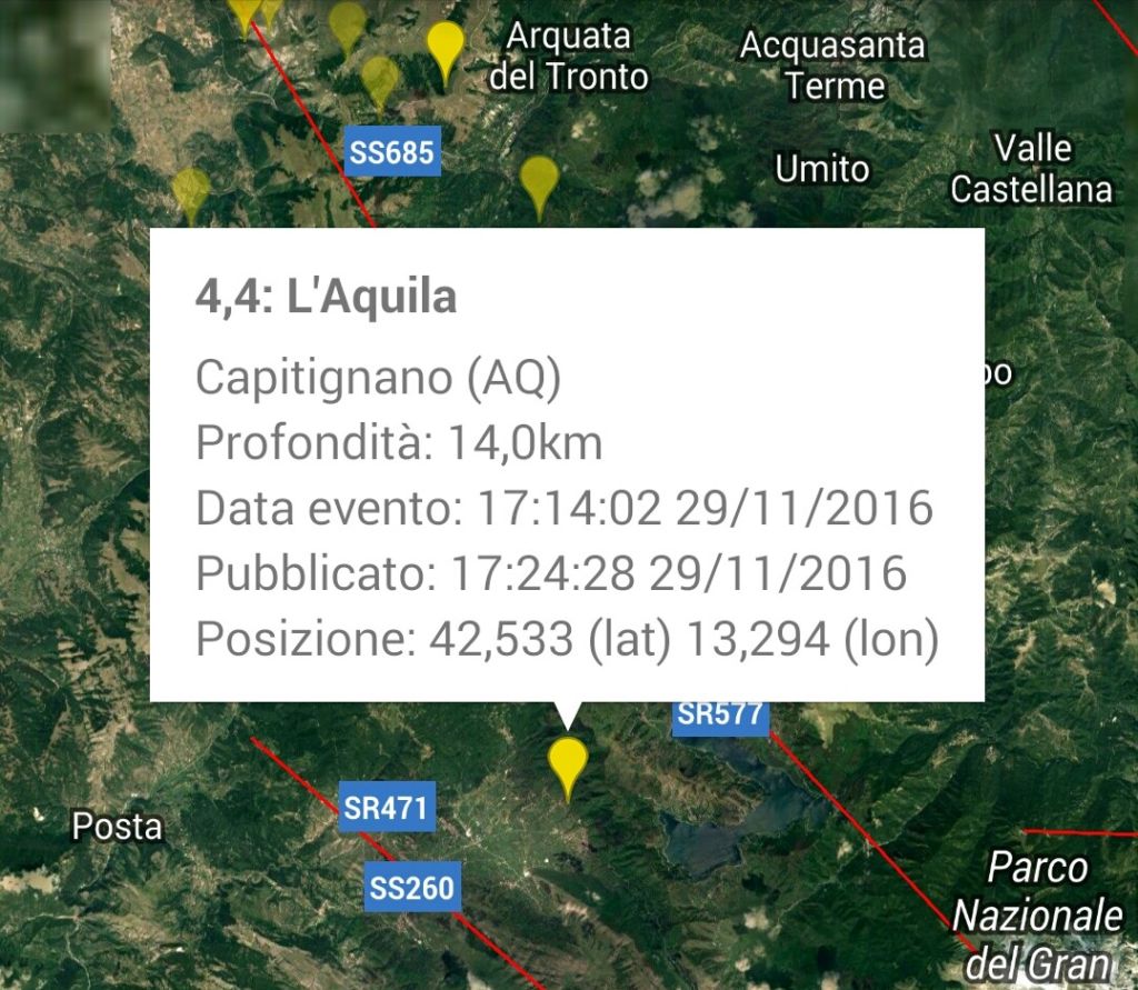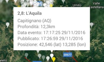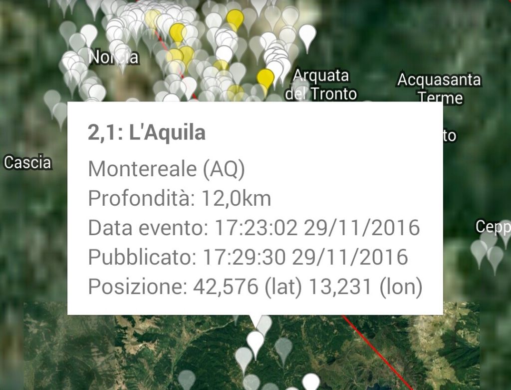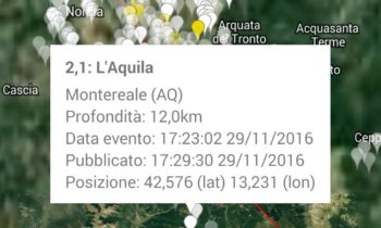 Trema la terra, forte scossa a L’Aquila avvertita in Umbria nel pomeriggio di martedì 29 novembre NORCIA – Non si fermano gli eventi sismici nel Centro Italia. Una scossa di terremoto di magnitudo 4.4 è stata registrata dall’Istituto Nazionale di Geofisica e Vulcanologia alle ore 17.14 del 29 novembre 2016. L’epicentro è a Capitignano in provincia de L’Aquila a una profondità di 14 chilometri con epicentro a 22 km a nord ovest. I Comuni limitrofi sono Capitignano, Montereale, Campotosto, Barete e Cagnano Amiterno. La scossa è stata nettamente avvertita a L’Aquila città, ed inoltre, in altri comuni abruzzesi, delle Marche e ad Amatrice nel Lazio.