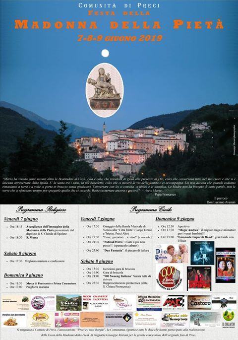 Nel paese di Preci come ogni anno si rinnova la festa patronale della Madonna della Pietà. Il borgo medievale pesantemente colpito dagli eventi sismici del 2016 rinnova le celebrazioni civili e religiosi con il ritorno della Madonna della Pietà. Il programma si svolgerà nell’arco del week a partire da venerdì 7 sino a domenica 9 con vari spettacoli che culmineranno con lo spettacolo pirotecnico. Tutto questo con la partecipazione della nuova amministrazione. (da Diego Montani)
