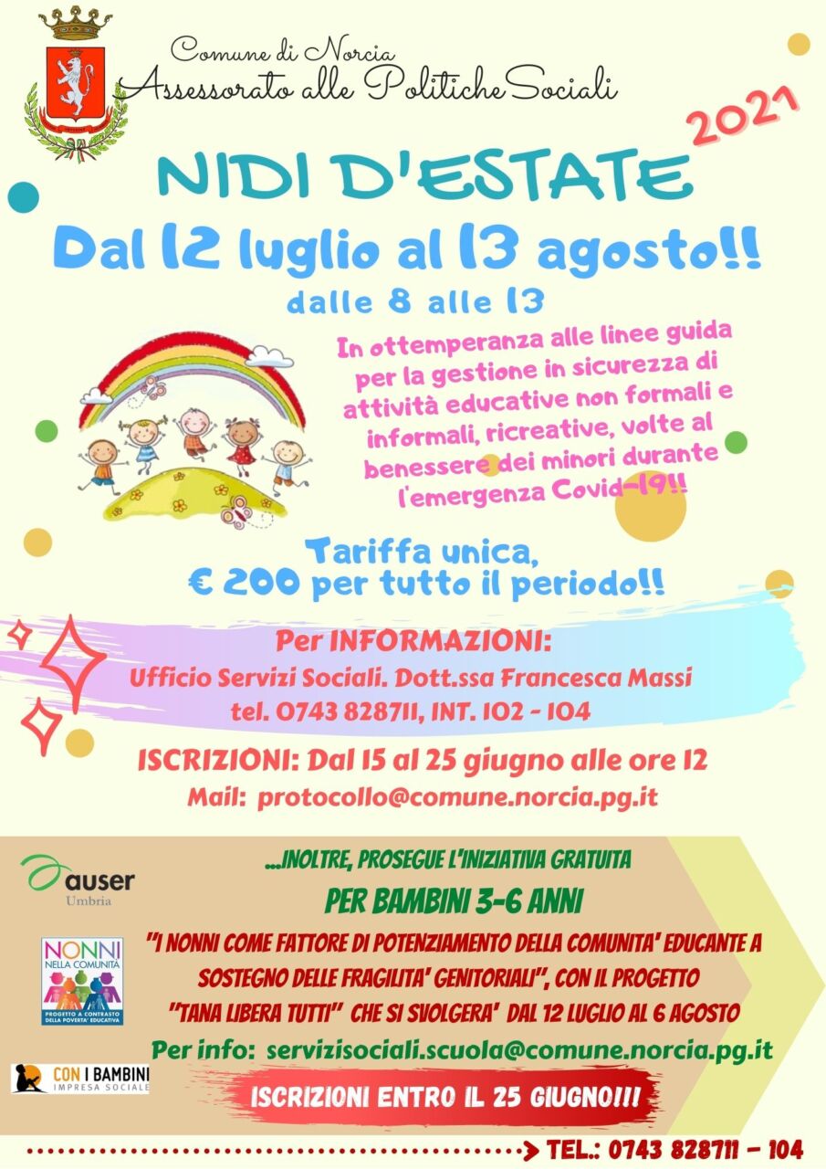 Prenderanno il via il prossimo 12 luglio i nidi d’estate del Comune di Norcia, rivolto alla fascia d’età 3 – 36 mesi fino al 13 agosto. Le attività si svolgeranno dalle 8 alle 13, da lunedì al venerdì.