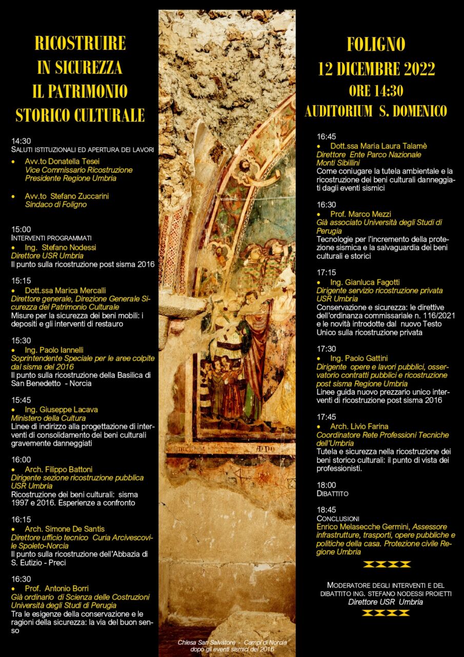 “Ricostruire in sicurezza il patrimonio storico culturale”. È questo il titolo del convegno/dibattito organizzato dall’Ufficio Speciale Ricostruzione Umbria (USR Umbria), con il patrocinio del Comune di Foligno, e la partecipazione della Soprintendenza ai BB.CC., che si terrà il 12 dicembre 2022, a partire dalle ore 14,30, nell’Auditorium San Domenico a Foligno.