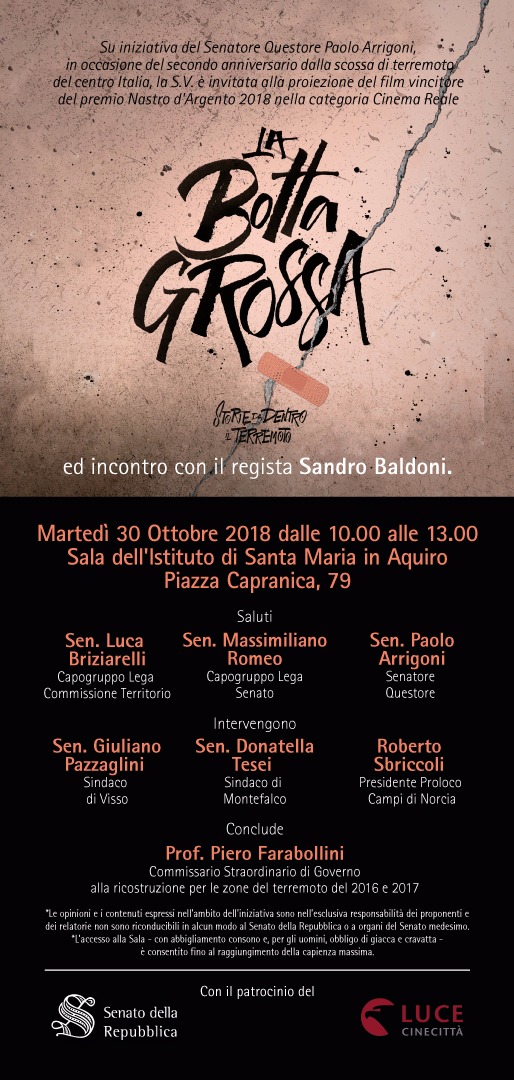 La botta grossa. Storie da dentro il terremoto, proiezione a Roma Martedì 30 ottobre alle 10:00, in occasione del secondo anniversario degli eventi sismici del 2016 che colpirono l’Umbria, presso la Sala dell’Istituto di Santa Maria in Aquiro (Piazza Capranica 79, Roma), verrà proiettato il film vincitore del “Nastro d’Argento 2018” nella categoria “Cinema Reale”, “La botta grossa. Storie da dentro il terremoto” del regista Sandro Baldoni.