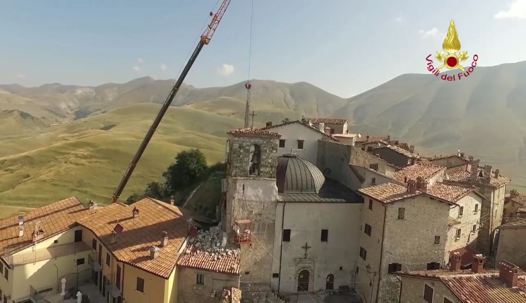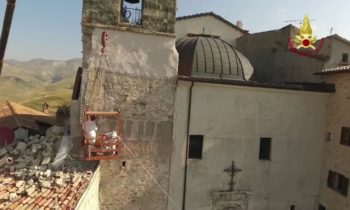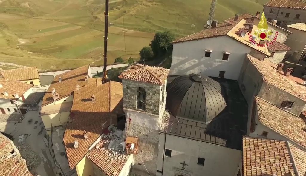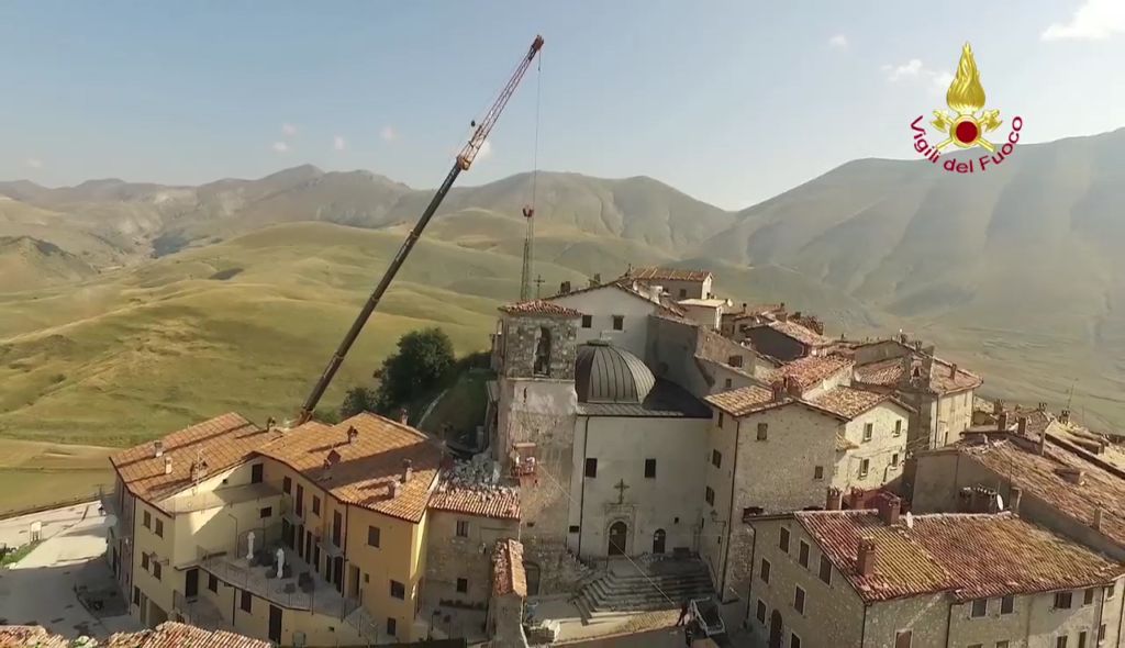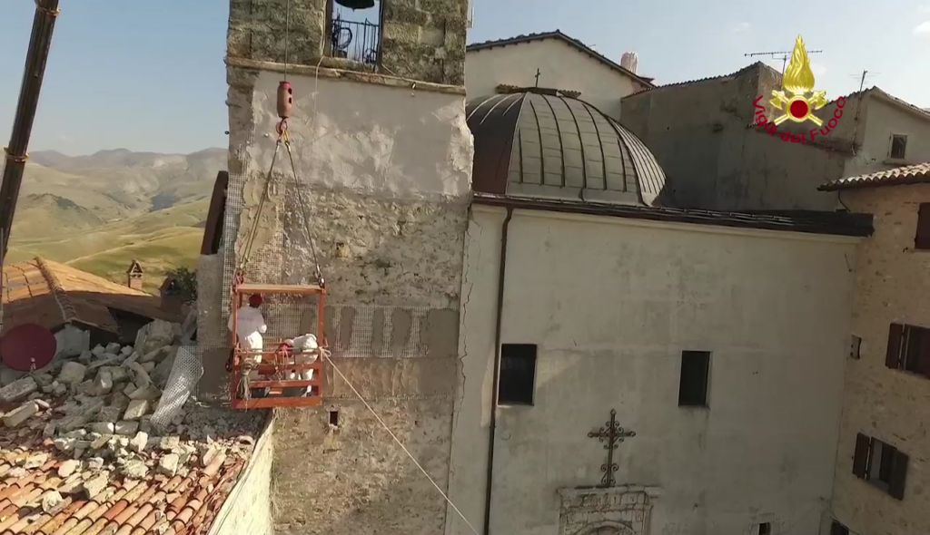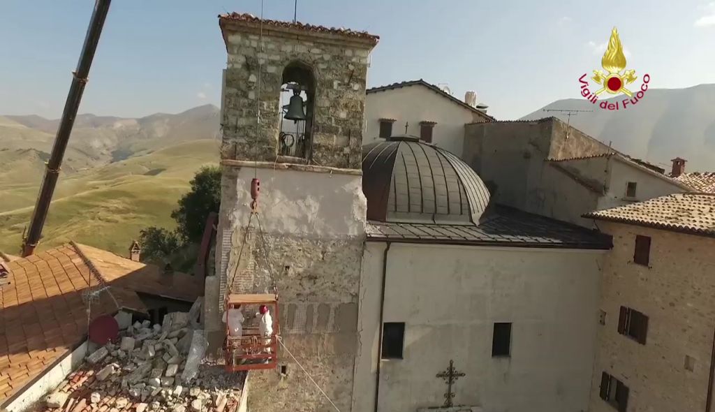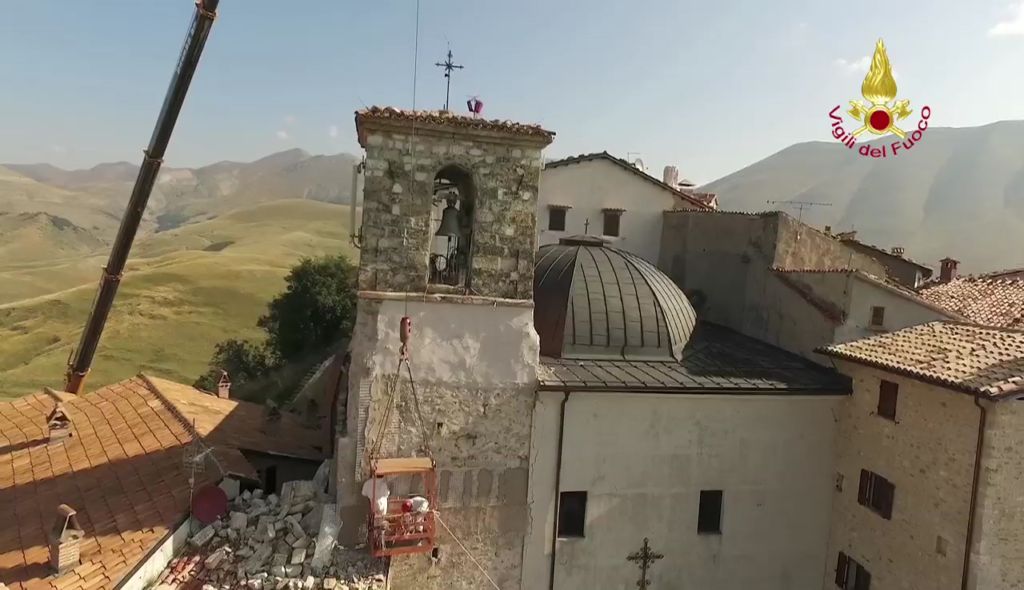Lotta contro terremoto, Vigili del fuoco per salvare campanile Castelluccio di Norcia Lavori di riduzione della criticità strutturale del campanile annesso alla Chiesa di S. Maria Assunta in Castelluccio di Norcia – Castelluccio di Norcia campanile della chiesa di Santa Maria Assunta Si tratta di una struttura che risale al 1800 e che si trova al centro abitato ed è caratterizzato da una struttura muraria mista la parte sommitale della torre campanaria è costruita con pietre squadrate e tenuta in posizione con numerosi tiranti metallici. La parte inferiore gravemente danneggiata è realizzata con muratura di materiali vari.