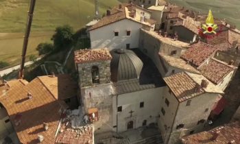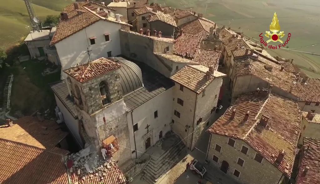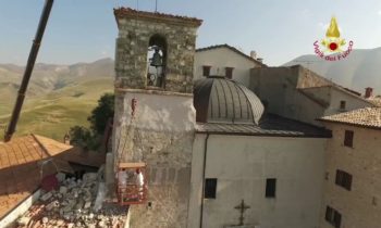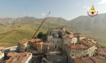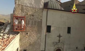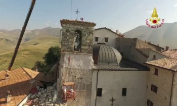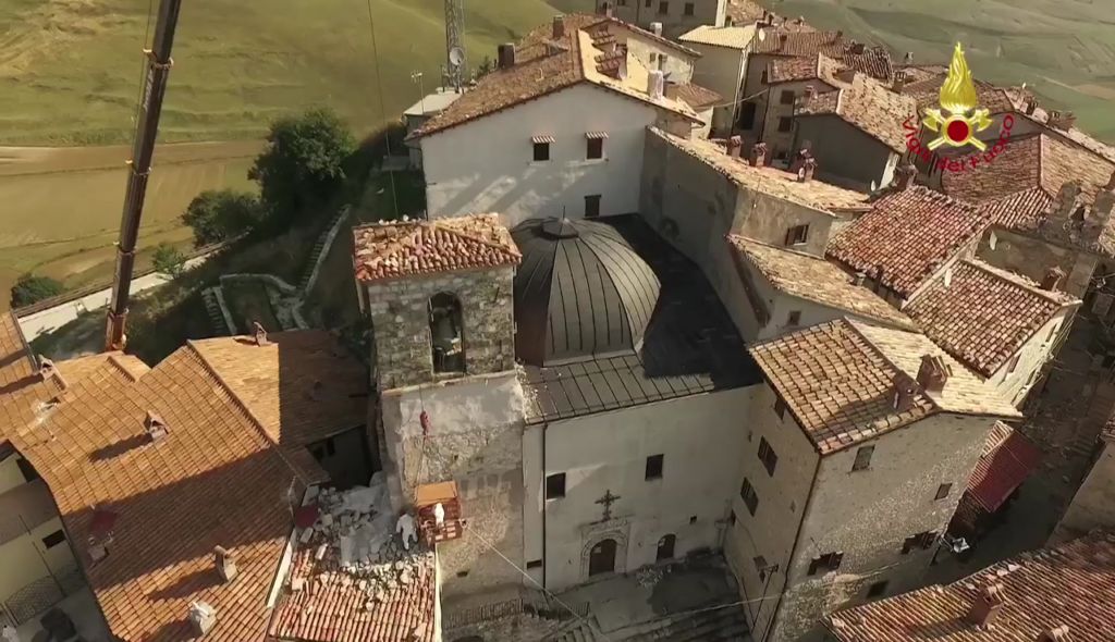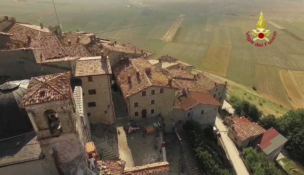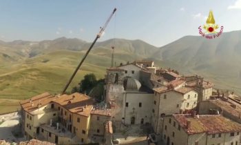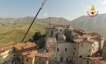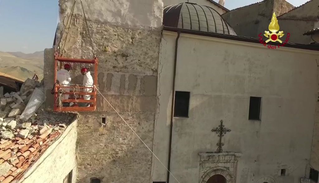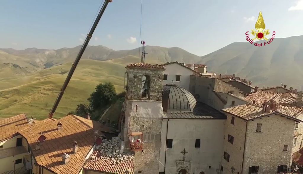 Lotta contro terremoto, Vigili del fuoco per salvare campanile Castelluccio di Norcia Lavori di riduzione della criticità strutturale del campanile annesso alla Chiesa di S. Maria Assunta in Castelluccio di Norcia – Castelluccio di Norcia campanile della chiesa di Santa Maria Assunta Si tratta di una struttura che risale al 1800 e che si trova al centro abitato ed è caratterizzato da una struttura muraria mista la parte sommitale della torre campanaria è costruita con pietre squadrate e tenuta in posizione con numerosi tiranti metallici. La parte inferiore gravemente danneggiata è realizzata con muratura di materiali vari.